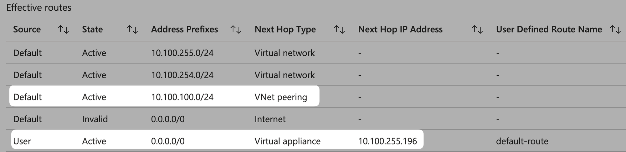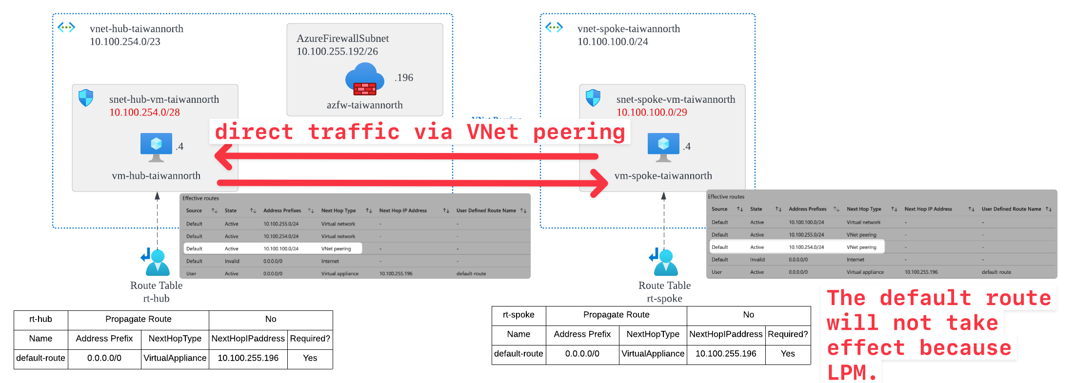 So... when the source IP of vm-hub-taiwannorth is 10.100.255.4 and the desination IP of vm-spoke-taiwannorth is 10.100.100.4, it will NOT route according to the default route 0.0.0.0/0 you hvae set. Instead, it will first use the directly connected Default system route 10.100.100.0/24 to reach the destination IP.