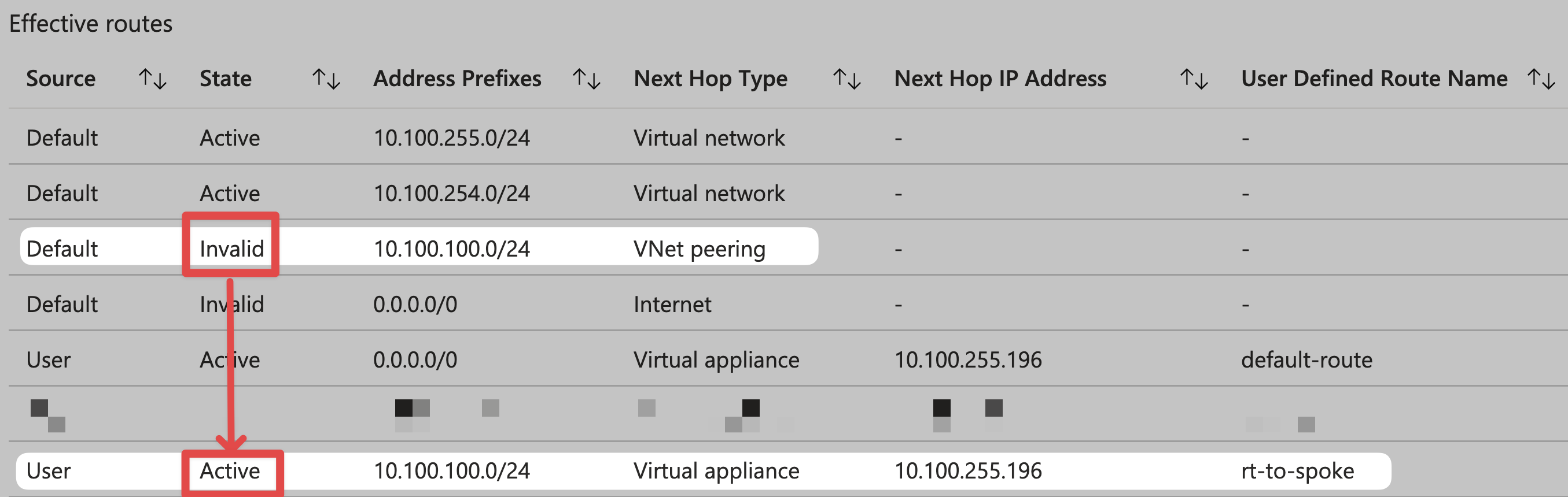 You will see that the defaulr route status of 10.100.100.0/24 has become Invalid from Active, and it has been replaced by the route we wrote ourselves.