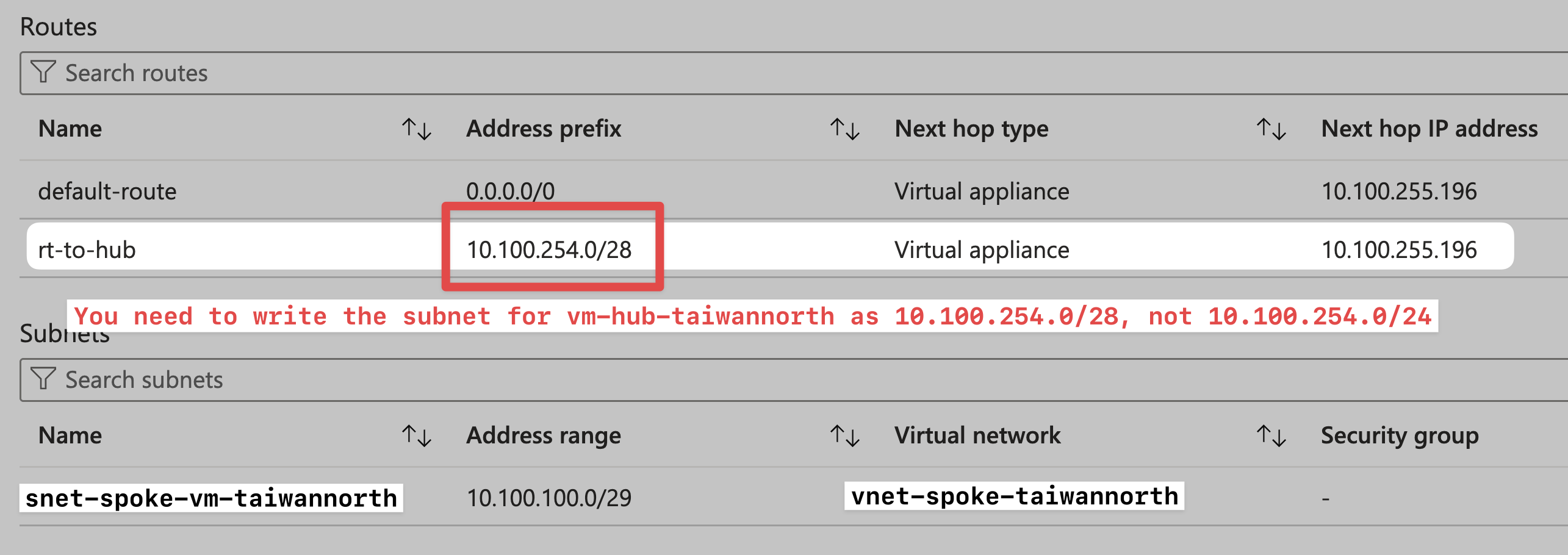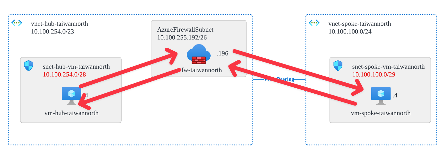NOTE: You need to clearly know the subnet range (10.100.254.0/28) when vm-hub-taiwannorth is located, rather than directly entering the entire Hub VNet range (10.100.254.0/23). Doing so will cause vm-spoke-taiwannorth to be unable to route to the Azure Firewall Service if they are all placed under the same address prefix.
