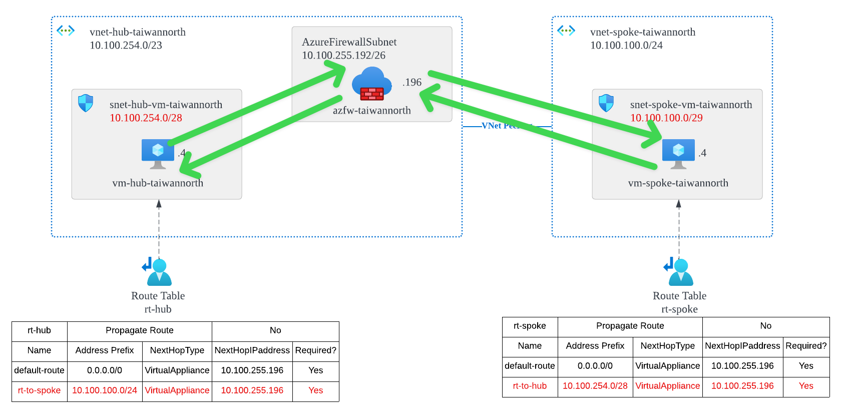 Add a new route, 10.100.254.0/28 NH 10.100.255.196, to ensure that traffic to vm-hub-taiwannorth (10.100.254.4) passws through Azure Firewall.