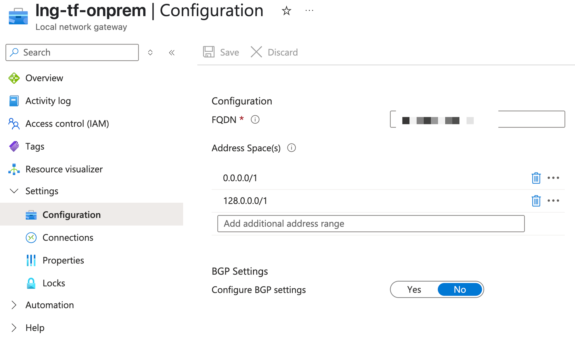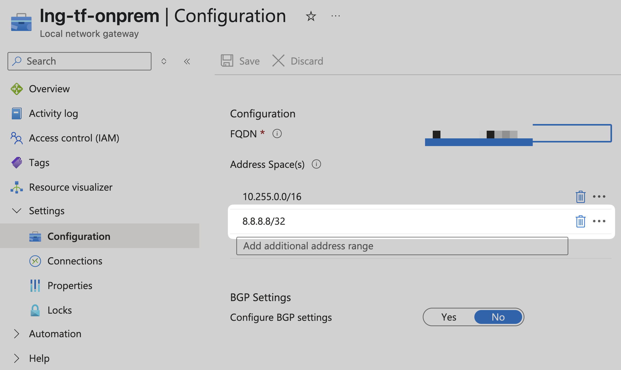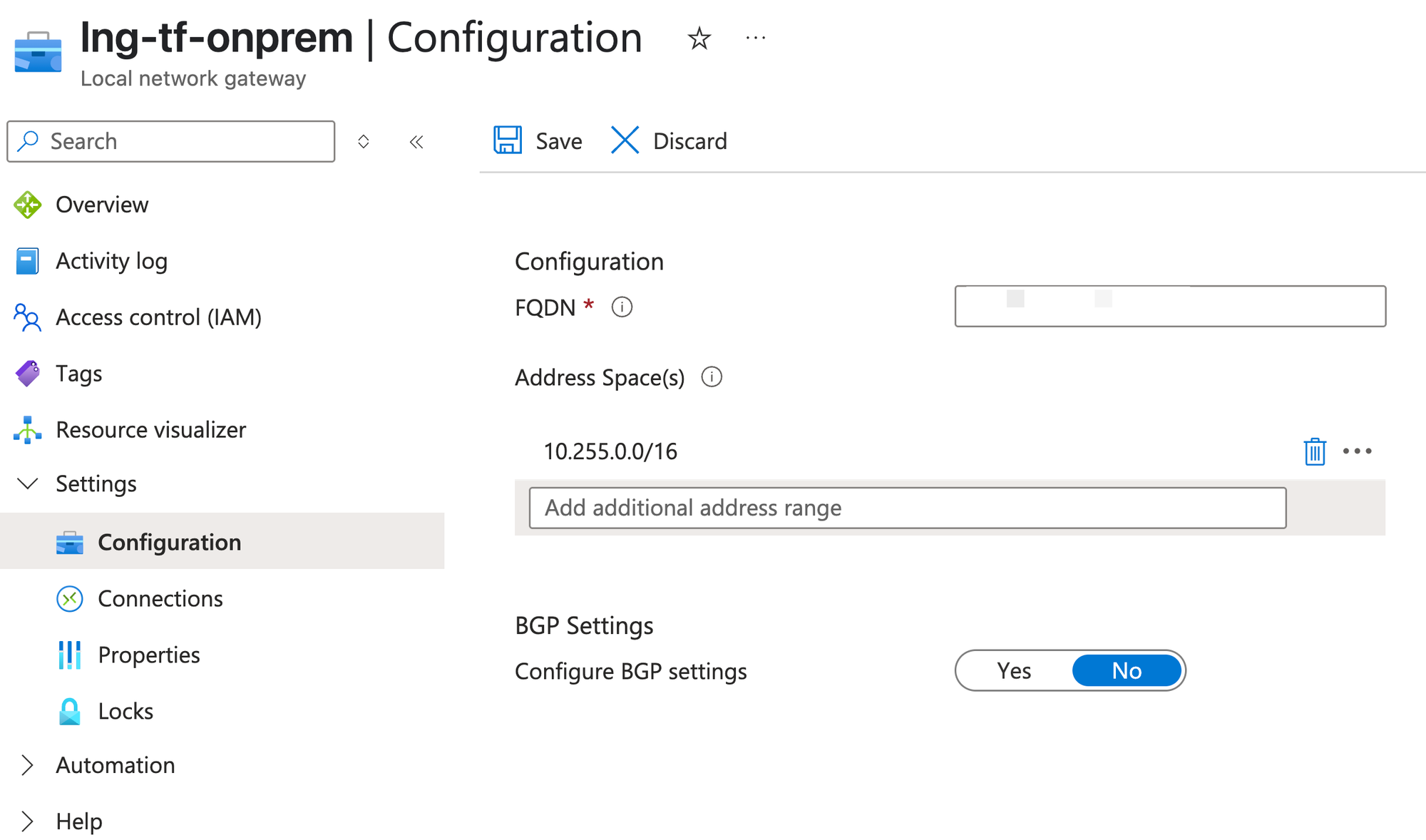 The configuration below routes any traffic destined for the 10.255.0.0/16 network through the Local Network Gateway (lng-tf-onprem). Since we now need to cover the entire 0.0.0.0/0 address space, this setting must be adjusted accordingly.