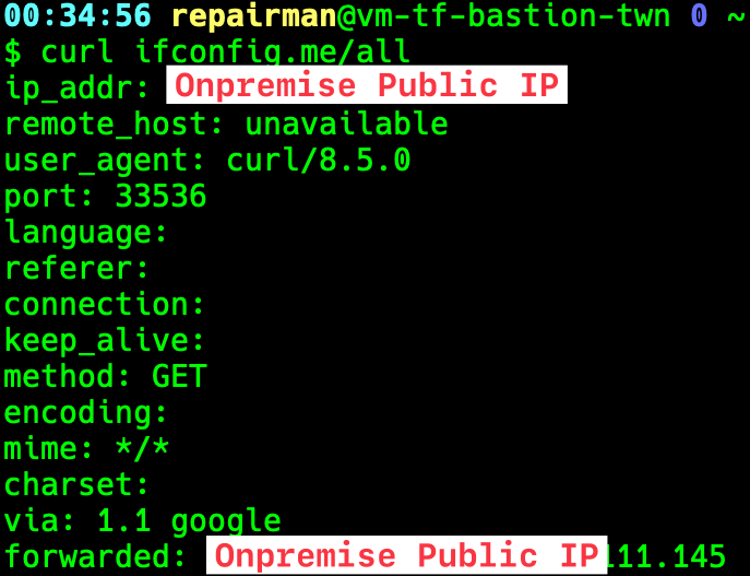 Use curl ifconfig.me to verify the external IP