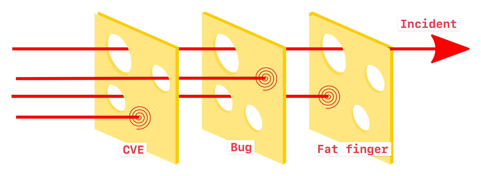The Swiss cheese model of accident causation illustrates that, although many layers of defense lie between hazards and accidents, there are flaws in each layer that, if aligned, can allow the accident to occur. In this diagram, three hazard vectors are stopped by the defenses, but one passes through where the "holes" are lined up.