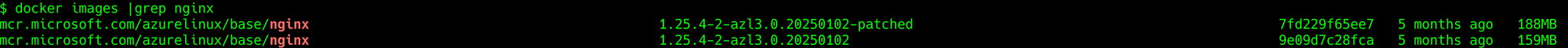 INFO[0072] Loaded image: mcr.microsoft.com/azurelinux/base/nginx:1.25.4-2-azl3.0.20250102-patchedpatch-by-copa.output