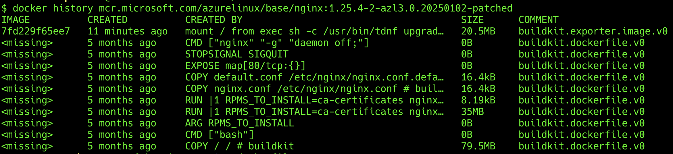 => diff (docker-image://mcr.microsoft.com/azurelinux/base/nginx:1.25.4-2-azl3.0.20250102) -> (sh -c /usr/bin/tdnf upg 0.1s
