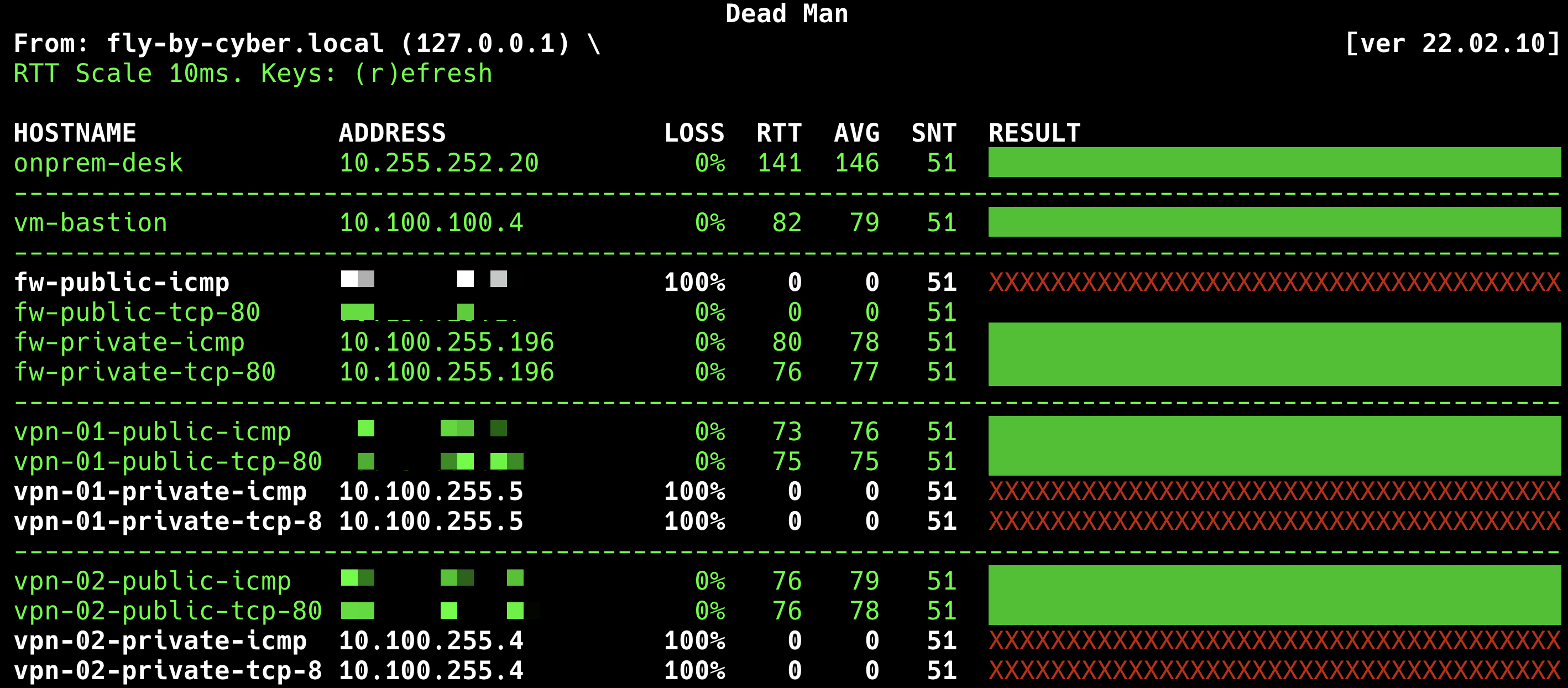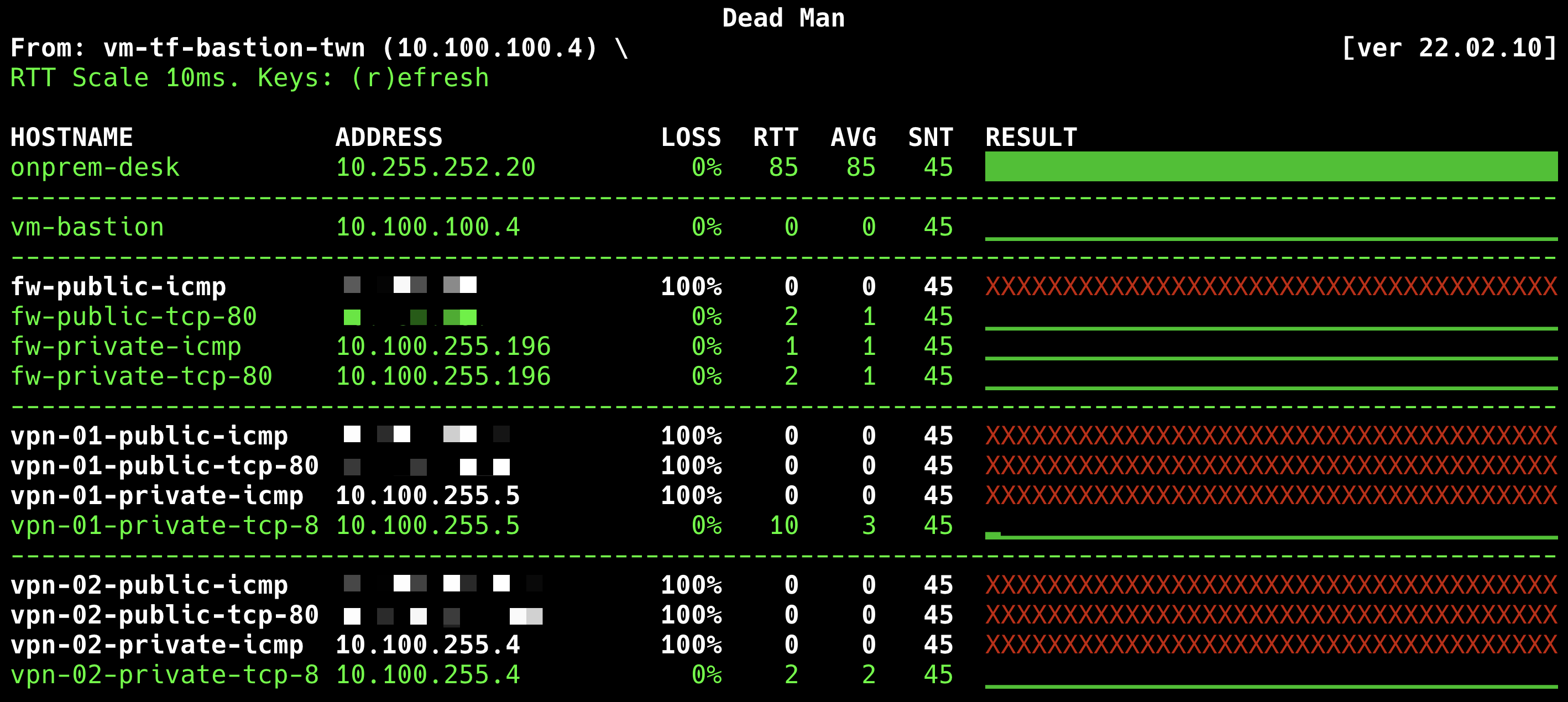 In order to quickly understand the current network connection status of the environment, this post will use upa/deadman - a curses-based host status checking application using ping to perform diagnostic tests on the real-time network connectivity of common Azure services.